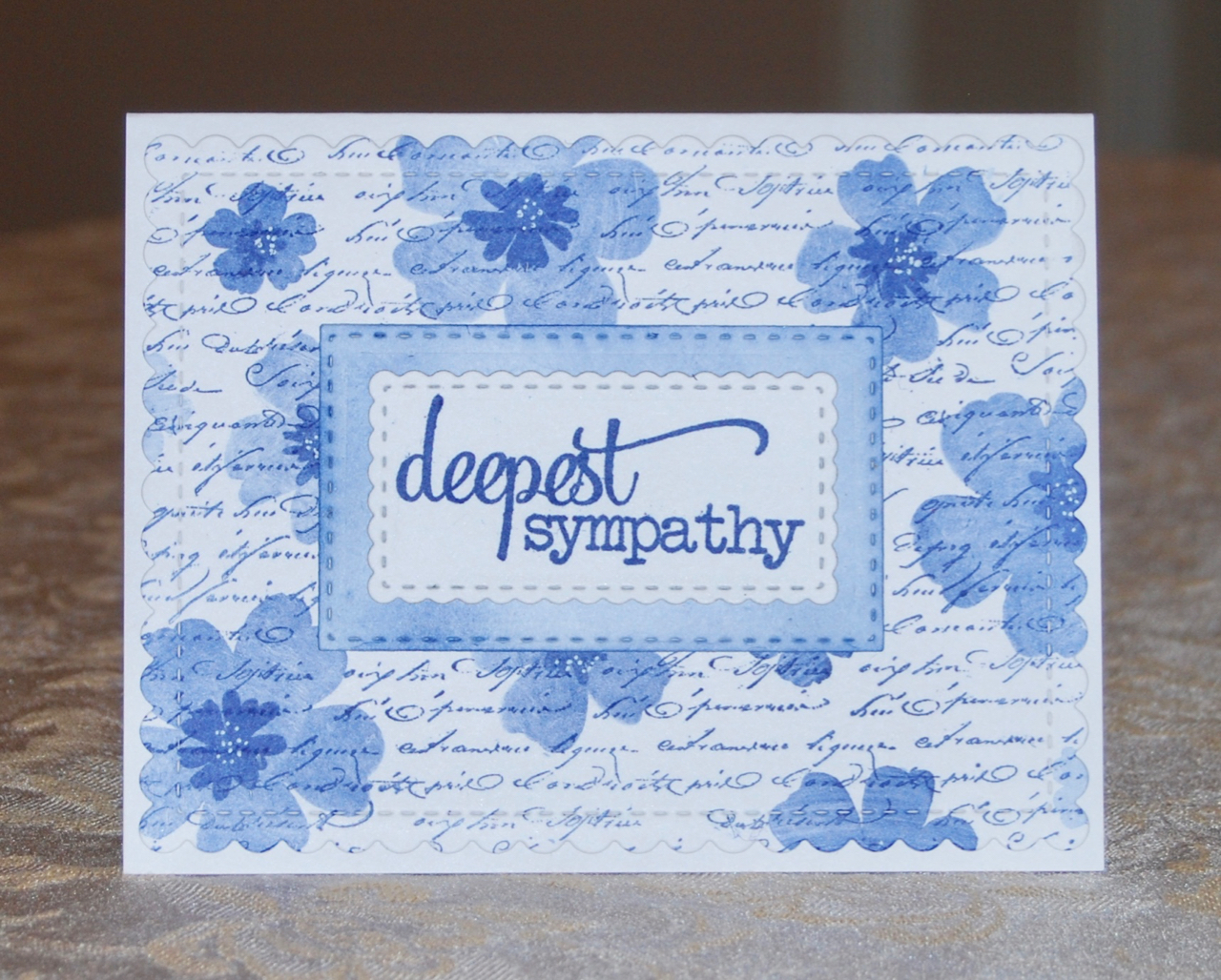 The background of this card was created with a wood-mounted background stamp featuring a delicate script. Over that I stamped images from Pressed Flowers by MFT. (Love it, but I think it might be retired. The sentiment panel and layer were cut from a PTI noted die. All the ink is Paris Dusk by Memento, with some of the stamping being second generation.
